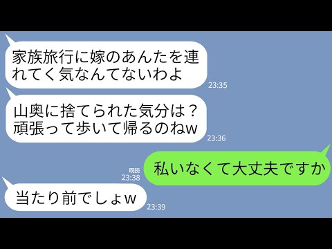 LINEで【LINE】車で家族旅行に向かう途中、嫁の私を山奥に強制下車させ置き去りにした姑「他人は連れてかないw歩いて帰れ」→5時間後、帰宅してテレビをつけたら姑が映っていた…w出てくると思わなかったわ