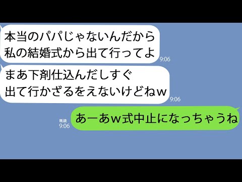 【LINE】連れ子の結婚式で俺の料理に下剤が…娘「偽物パパはもういらないのw」→本物の父親を呼び出し席に座ってもらったらなぜか即破談になったwって動画が話題らしいぞ