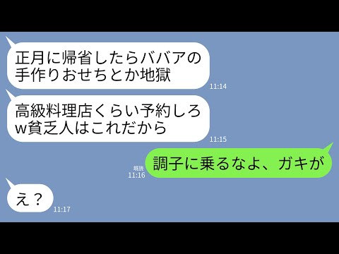 【LINE】長男夫婦が正月に帰省し私がおせち料理を作ると長男嫁「ババアの手作りとか地獄w高級店予約するのが普通だろ」→直後、温厚な夫「調子に乗るなよ、ガキが」→結果www