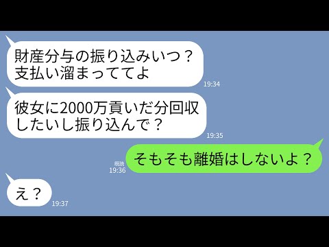 【LINE】離婚の財産分与をあてにして若い愛人に2000万を貢いだ夫「振り込みいつだよ?支払い溜まってるから早くして」→私「離婚はしないよ?」夫「え?」→絶望の展開へ…w