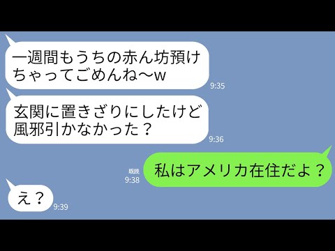 ラインで【LINE】0歳児の子供をうちの玄関に放置して彼氏と温泉旅行に行った義妹「1週間預かってくれてありがと〜w」→私「うちはアメリカだけど?」義妹「え?」→結果…出てくると思わなかったわ