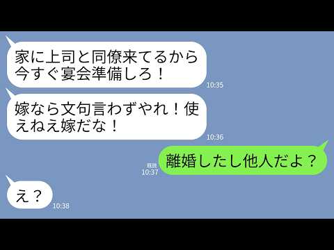 LINEで【LINE】1年前に離婚したはずの元夫から怒りの連絡「家に上司と同僚来てるから宴会準備しろ!嫁なら文句言わずやれ!」私「もう他人だよ?」→勘違い男に現実を叩きつけてやった結果www出てくると思わなかったわ