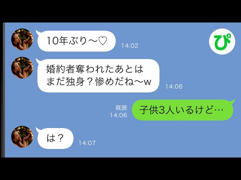 【LINE】10年前に私の婚約者を奪って駆け落ちした幼馴染「婚期逃しちゃったもんねwまだ独身とか惨めw」私「子供3人いるけど…」幼馴染「は?」【スカッと修羅場】