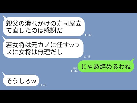 【LINE】15年間休みゼロで潰れかけの義父の寿司屋を支えて人気店にした私を捨て元カノを女将にした夫「女将は美人じゃないとw」→速攻で仕事辞めて永遠に出て行った結果www