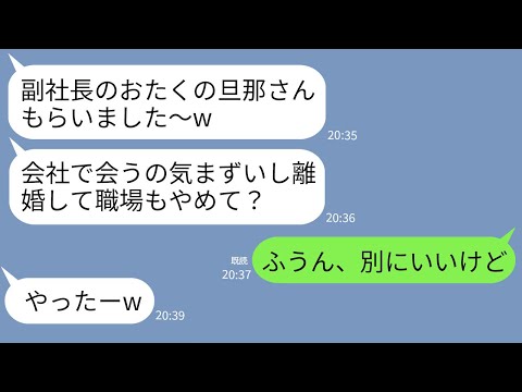 LINEで【LINE】15歳下の後輩女から副社長の夫を略奪報告「副社長の旦那さんもらいましたwババアは離婚して会社もやめろ」→お望み通り速攻で離婚して私の正体伝えたら女が真っ青にwww出てくると思わなかったわ