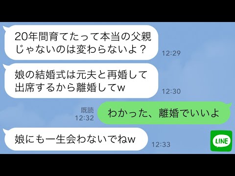 【LINE】20年間、実の子として育てた連れ子が結婚。妻「元夫と再婚するからあんたは用済みw」→要求通りに離婚したら連れ子の結婚式が大変なことにwwwって動画が話題らしいぞ