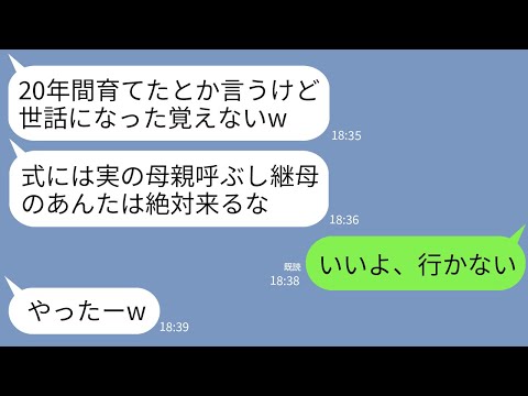 【LINE】20年間世話してきた継母の私に感謝もせず結婚式に招待しない夫の連れ子「式には実の母親呼ぶし他人は来るなw」→お望み通りに欠席したら女の結婚式が大変なことにwww