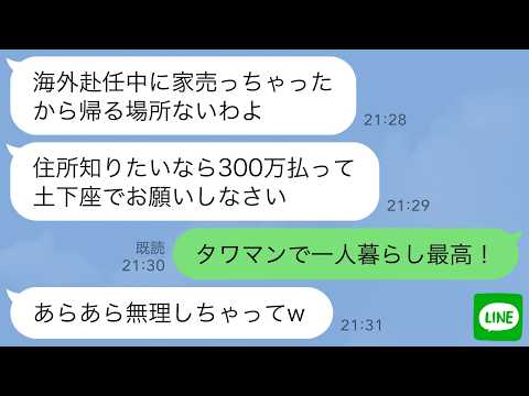 LINEで【LINE】3年の海外赴任から帰ると義実家が売却済みに…。義母「二世帯住宅建てて引っ越したw300万払えば住所教えるw」→私「タワマンで一人暮らし最高!」→大喜びで離婚届を提出した結果w出てくると思わなかったわ