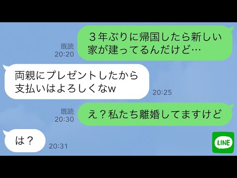 【LINE】3年間の海外赴任から戻ると敷地にもう1軒家が建っていた…無職夫「両親にあげたから支払いはよろしくw」私「え?私たち離婚成立してますよ」夫「え?」