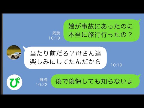 【LINE】GWの旅行前日に小1娘が交通事故に遭い緊急搬送された…夫「じゃあお前らは留守番で」→私と娘を置いて義両親と旅行を楽しむ夫に私はブチギレ【スカッと修羅場】って動画が話題らしいぞ