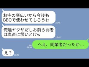 【LINE】気弱な夫婦の私達を舐めて勝手に庭に侵入してBBQして騒ぐ隣の自称ヤクザのDQN「ゴミはお前らで片付けろよw」→夫が正体を現したら自称ヤクザが震え上がることにwww
