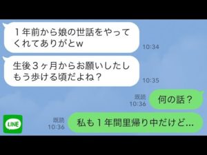 【LINE】義姉が0歳児を玄関に置き「1年前から娘の世話ありがとw」→私「え?私も1年間里帰り中だけど…」【スカッとする話】【2ch修羅場】
