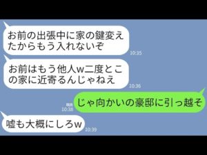 【LINE】長期出張から戻ったら玄関の鍵が変えられていた…。夫と義母「もうお前に帰る場所ないよw」私「了解!」→大喜びで向かいの大豪邸に引っ越した結果www
