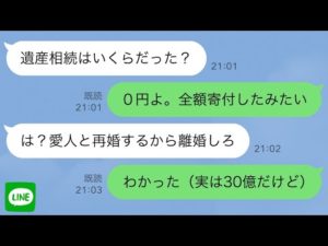 【LINE】父の遺産30億を相続した私に、夫「いくら相続した?」私「0円よ、全て寄付したみたい」嘘の金額を教えた→夫は私を捨てて浮気相手と再婚→その末路が悲惨すぎるw