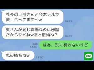 【LINE】17歳下の後輩女から社長の夫を略奪報告「今、社長の旦那さんとホテルなのwババアはクビにして離婚しろ」→お望み通り速攻で離婚して夫の正体伝えたら女が顔面蒼白にwww