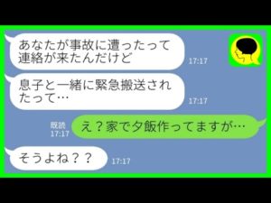 【LINE】義母から突然の連絡「息子とあなたが事故に遭って緊急搬送されたって連絡が来たんだけど…」私「家で夕飯作ってますけど…」→夫の事故の真相が…www