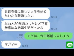 【LINE】部長昇進と同時に20年連れ添った私を捨てる夫「エリートの俺に相応しい女と結婚するw財産分与もしない」→お望み通り即離婚したら調子に乗りすぎて降格した結果www