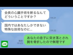 【LINE】俺が天才外科医だと知らず階段から突き落とした同級生「貧乏人は同窓会に来るなw」→腕を骨折したので担当手術を6ヶ月分キャンセルすると…